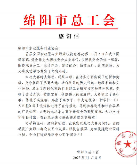 綿陽市家政服務(wù)行業(yè)協(xié)會力助首屆全國家政服務(wù)業(yè)技能競賽決賽在綿陽圓滿落幕,綿陽市總工會高度贊揚(yáng),綿陽市美新家政熱烈祝賀!